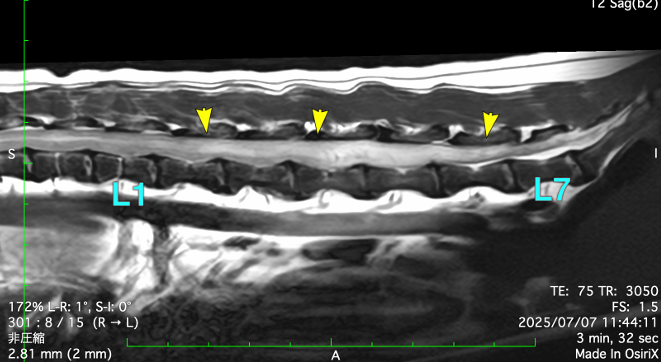 MRI画像では、腰椎間に大きな椎間板ヘルニアと、脊髄内に広がる高信号領域(浮腫や壊死の兆候)が確認されました。この時点で私たちは、進行性脊髄軟化症可能性が極めて高いと診断しました。